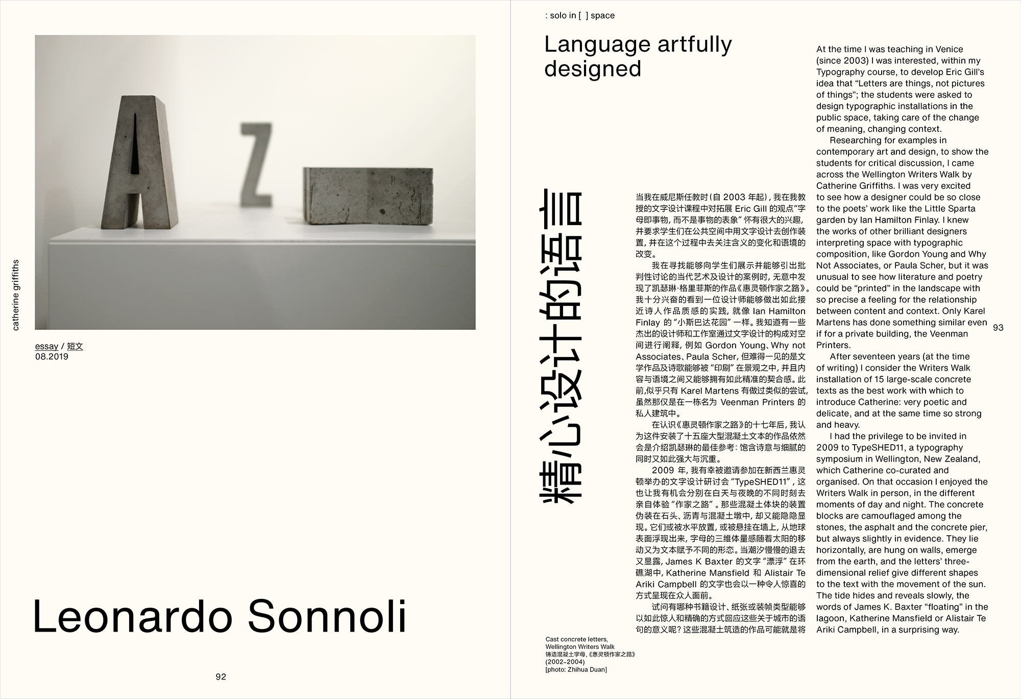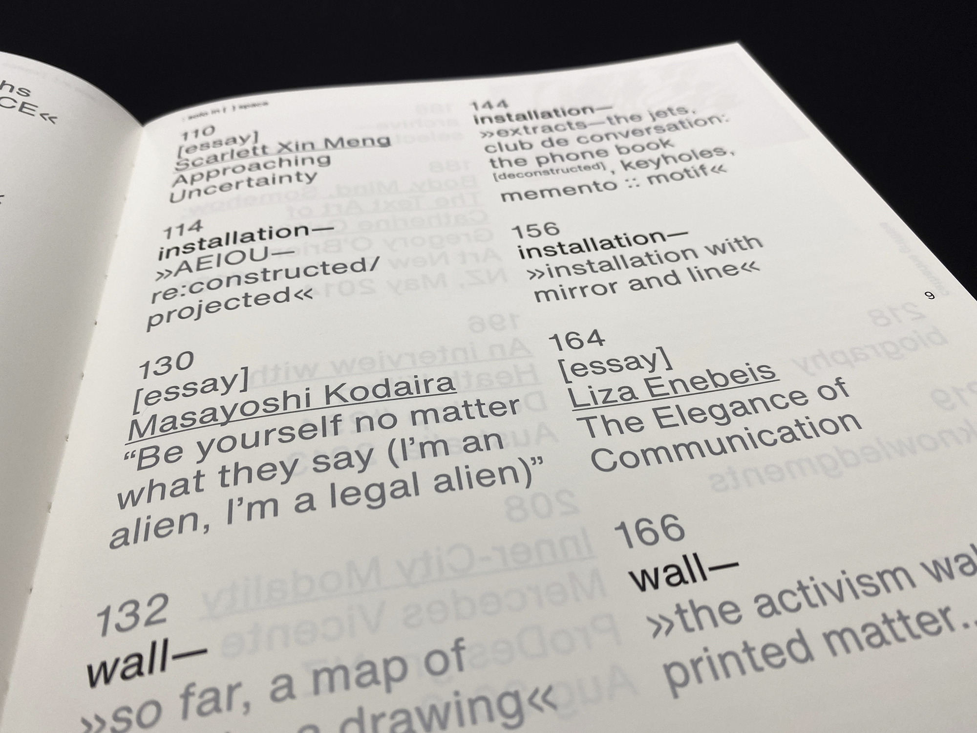 Included are five short essays — poetic, meditative, observational — by Leonardo Sonnoli (Italy), Liza Enebeis (Netherlands), Masayoshi Kodaira (Japan), Anastasia Genkina (Russia) and Scarlett Xin Meng (China). As well, from the archive of selected writing, Gregory O’Brien’s Body, Mind, Somehow: The Text Art of Catherine Griffiths for Art New Zealand’s 150th issue (2014), and a review of »AEIOU, a typo/sound installation« (2009) by curator, writer and researcher Dr Mercedes Vicente, give clues and insights into what simply cannot be gathered in this one space, this moment in time.