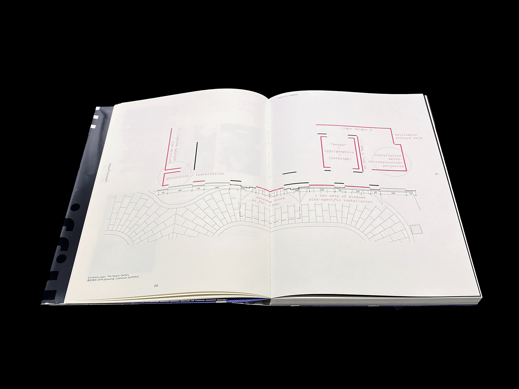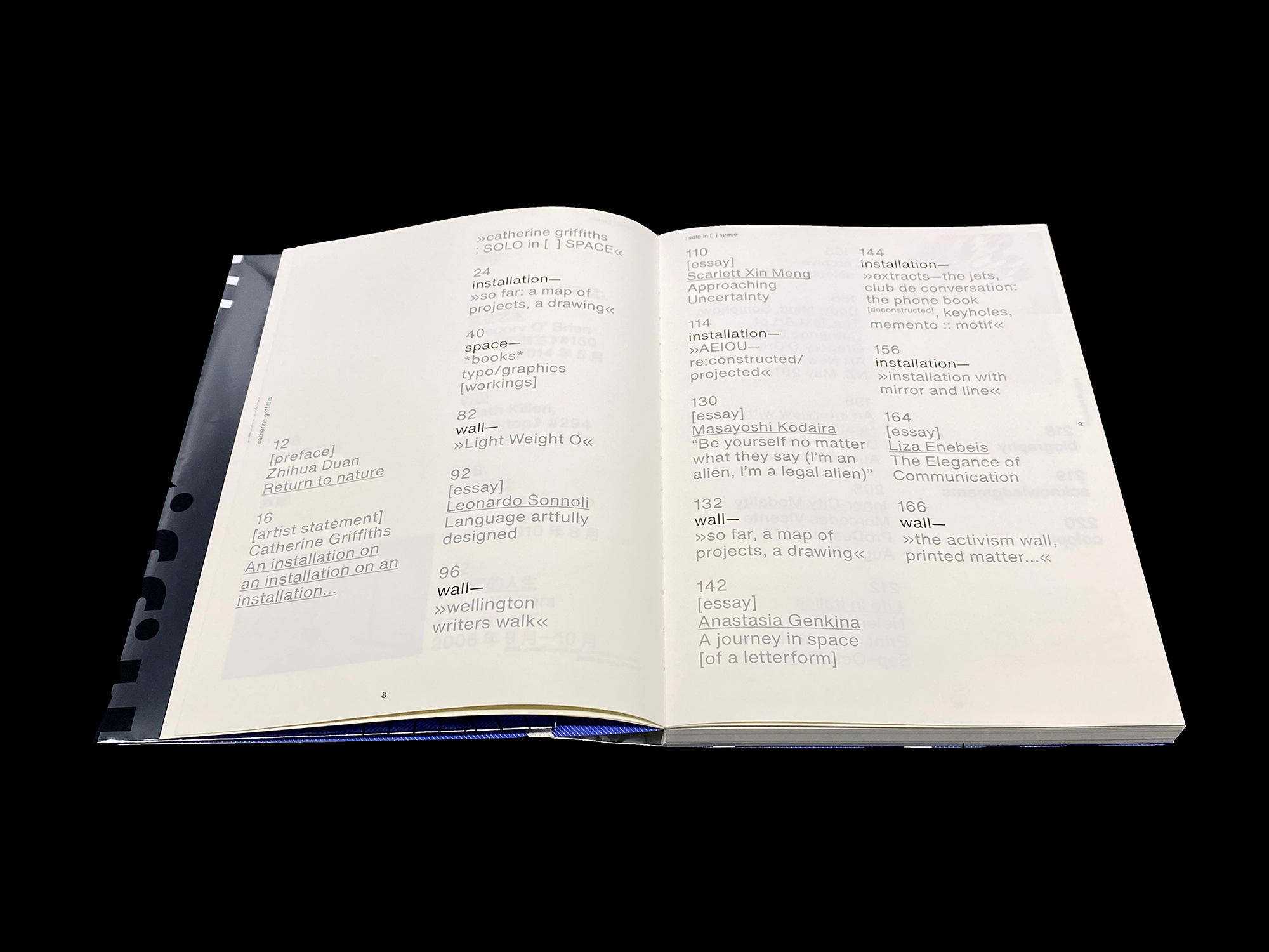The post-exhibition book »catherine griffiths : SOLO IN [ ] SPACE« A documentation is an ‘installation on an installation on an installation’ — works made over time and space, re-configured, re-contextualised and responsive.
