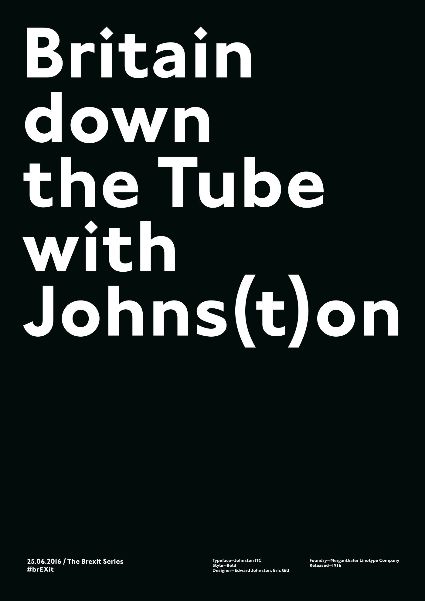 A political poster series, posing as type specimens, on the blundering beast of Brexit, a riff off a Twitter post by London-based designer and educator Hamish Muir, “The past, or the Futura?” the day before voting in the Referendum closed. A brief back-and-forth by email brought out a Univers witticism from Hamish, but as the shock and dismay at an EU exit took hold, it overwhelmed our humour. The speed and nature of events, and where this majority had come from, and what it might mean, wiped the smile from many ...