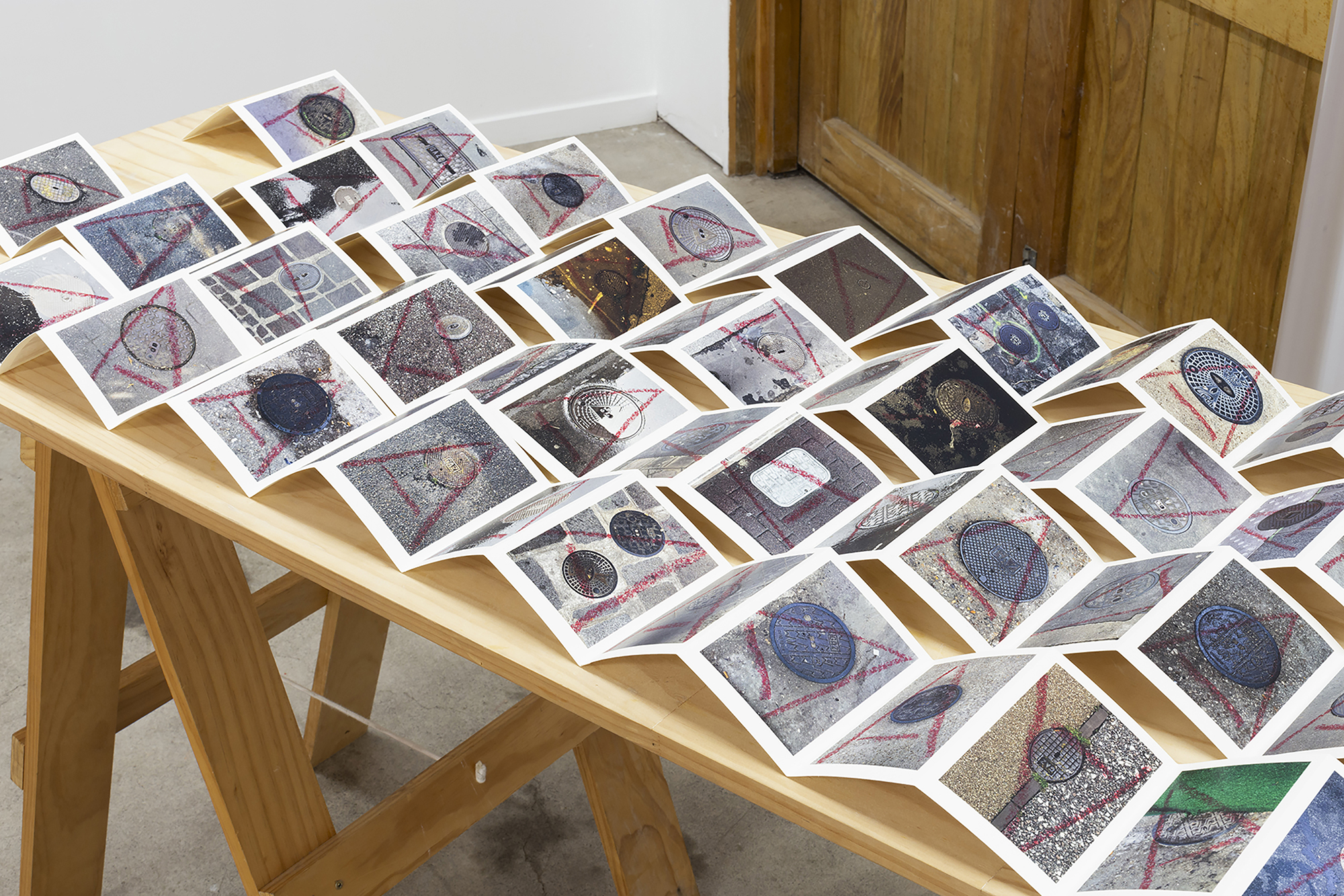 The »GAZ/A« series (2024) came about as a result of Griffiths’ time spent in Paris during 2023 and 2024, when she began documenting the cast iron gas covers she saw throughout the streets. The resulting concertina features a selection of photographs of these GAZ covers with Griffiths’ hand drawn ‘A’ atop them. »GAZ/A« scrutinizes “Israel’s premeditated intentions to displace the Palestinians from their historical lands and confiscate their natural resources.” [2]
