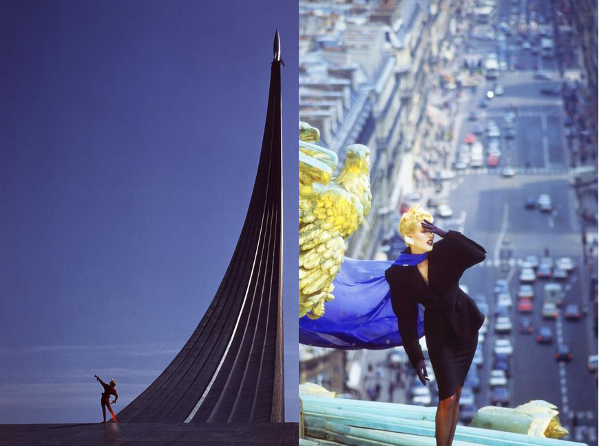 The shots were on colour film, processed as black and white prints. Slow exposure, extreme angle, our cues were taken from i-D, Blitz, The Face (see ‘Birth of The Face’ and interview with i-D founder Terry Jones in Eye 30) – cult literature we aspired to in our practice as nascent graphic designers. Thierry Mugler’s book Photographe in which he portrayed women as ‘victorious, strong, sensual and sexy’, took centre stage on the shelf in my London flat, its cover a daily reminder of how I wanted to be.